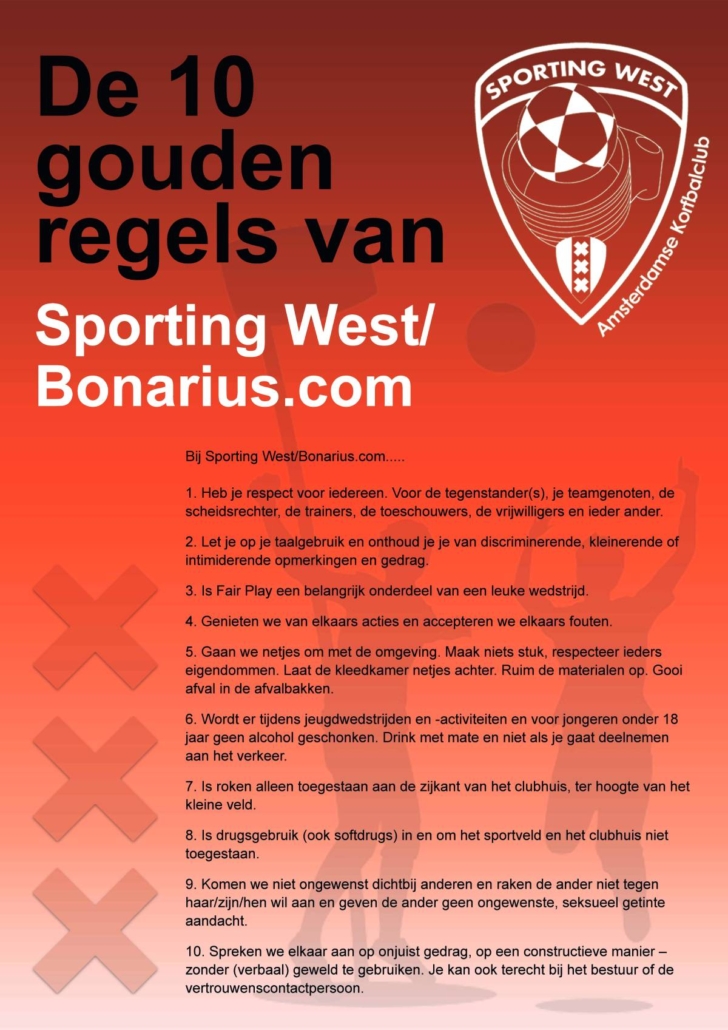 Onze 10 gouden regels en de gedragsregels vormen de basis van hoe we met elkaar omgaan, zowel op als naast het veld. We nodigen iedereen uit om die eens door te lezen — samen zorgen we ervoor dat Sporting West/Bonarius.com een vereniging blijft waar sportiviteit, respect en plezier vooropstaan.